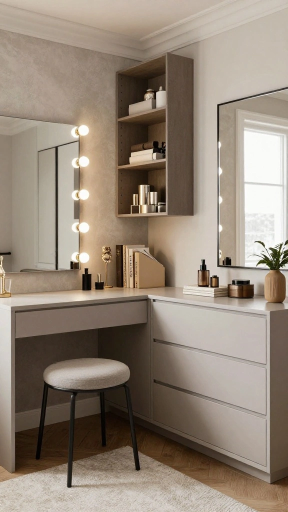 Make every piece multi-functional. Choose a vanity with ample drawers, a slim ottoman or bench with hidden storage, and a wall-mounted jewelry organizer to keep delicate pieces within reach. Tie everything together with matching hardware and finishes (brass, timber, or glass) so the room reads as a cohesive home decor ideas space. Add a small rug to define the seating zone and keep cords tucked away for a clean, chic look.