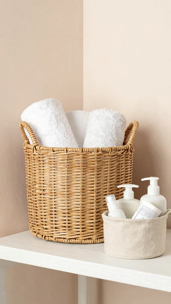 – Use rattan baskets to store rolled towels for a spa-like feel