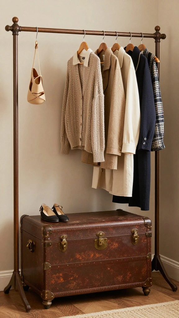 Add character to your dressing room closet with vintage finds. Be it a vintage trunk for storage or an antique clothes rack, these pieces bring personality and durability to your space. Plus, they often align with sustainable choices.