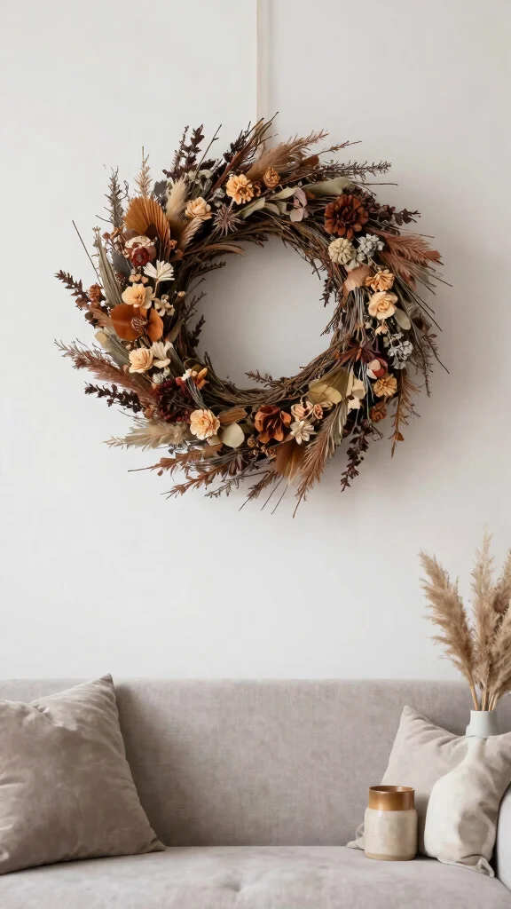 Enhance your living room with decorative wreaths made from twigs, leaves, and dried flowers, bringing a touch of nature indoors. This project allows you to create seasonal decor that can easily be updated throughout the year, making it a versatile addition to your home.