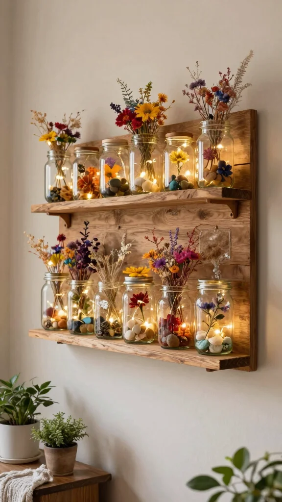 Fill each jar with dried flowers, fairy lights, or colorful sand to create a visually appealing arrangement. This DIY project is perfect for those looking to add a personal touch to their decor while contributing to an eco-friendly lifestyle.