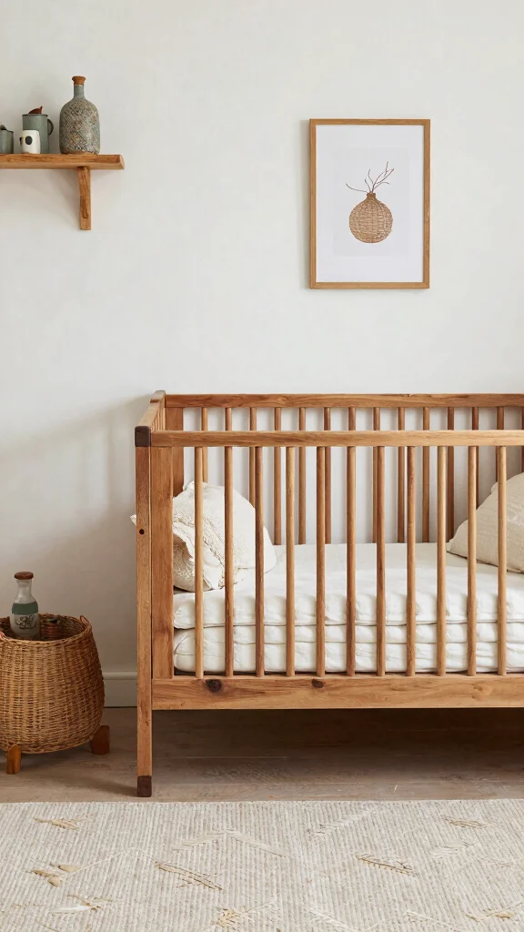 Use durable, sustainable materials and classic silhouettes for longevity. Choose stylish baby room accessories with clean lines, like a wooden dresser, a convertible crib, and woven textiles.