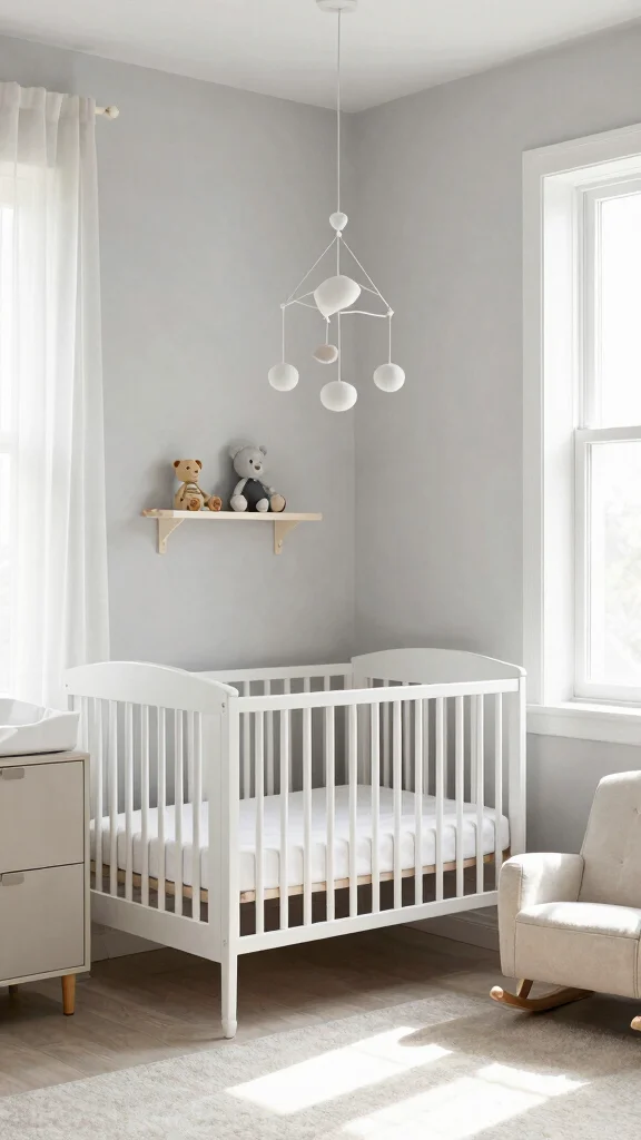 Stick to a monochromatic or muted pastel color scheme for a fresh and contemporary feel. You can add a couple of standout accessories, like a unique mobile or stylish art piece, to inject personality without overwhelming the room.