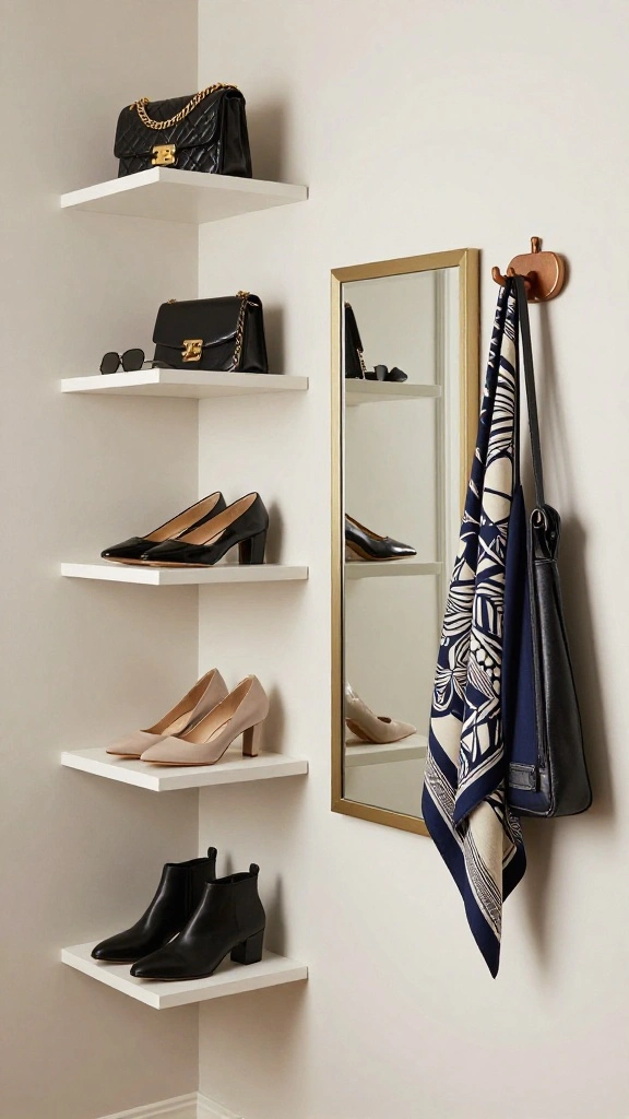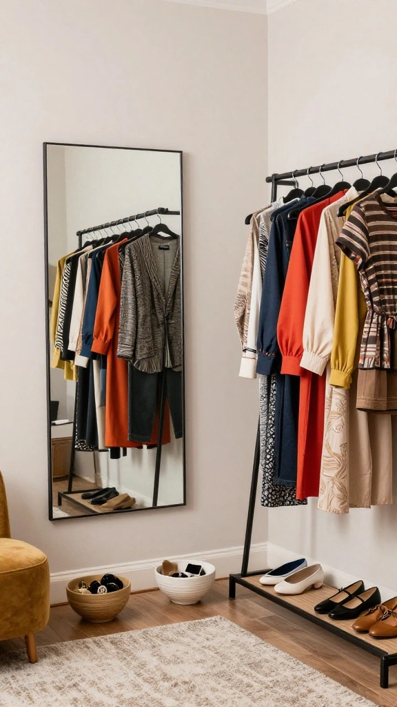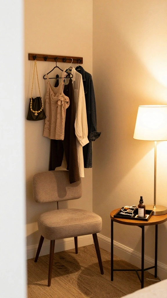 This setup not only keeps you organized but also adds a refined touch to your dressing area. Consider sourcing budget-friendly pieces to create a chic look without overspending.