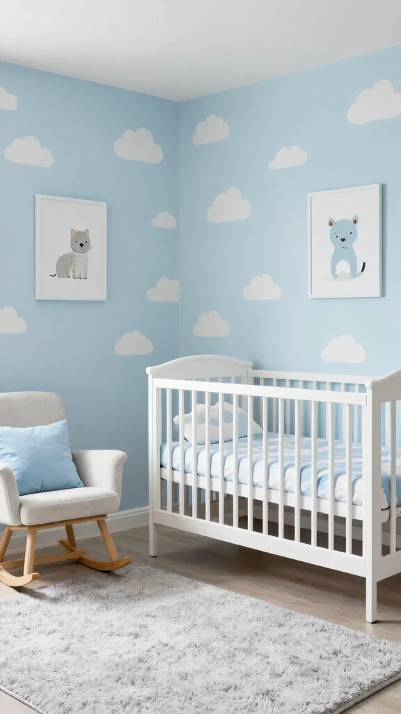 Soft sky blue brings a sense of calm and serenity to your baby boy’s room, making it a perfect choice for creating a soothing atmosphere. This gentle color works beautifully with white furniture, enhancing the airy feel of the space while promoting a peaceful environment. You can also add hints of grey or beige to create a more layered look, and playful accessories like cloud-shaped pillows or star stickers can keep the decor engaging and whimsical.