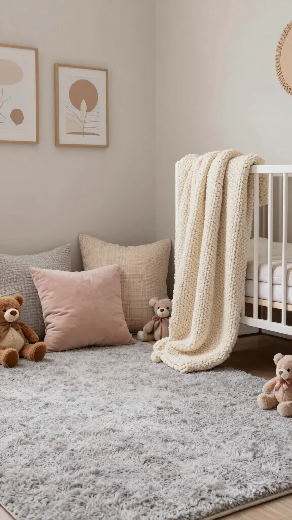 A cozy reading corner with a bean bag or floor cushions invites calm play, and a small mobile or wall art can add whimsy without overwhelming the space.