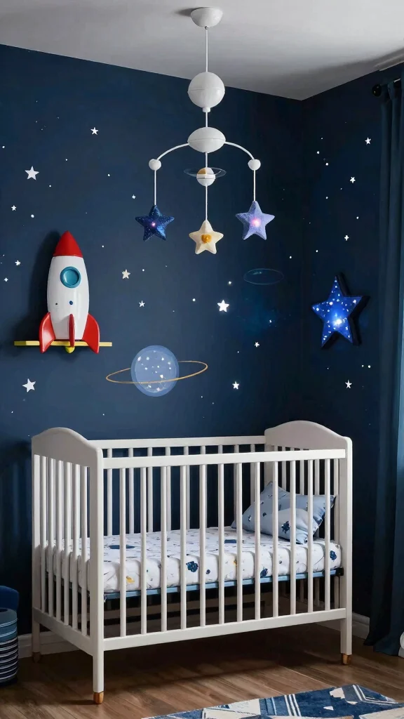 Choose a single statement piece, like a youthful yet refined mobile or a themed throw, and keep the rest simple.
