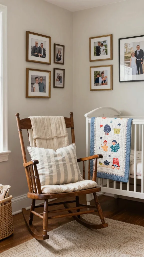Consider incorporating personal touches, like framed family photos or handmade crafts, to create a unique atmosphere that tells your family’s story. This blend of art and personal mementos adds depth and character to the nursery.