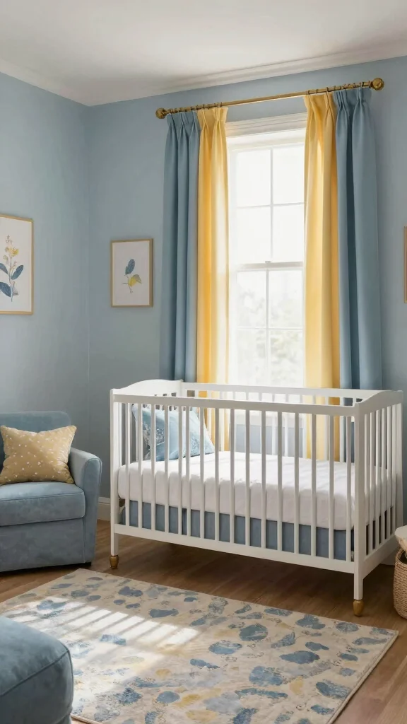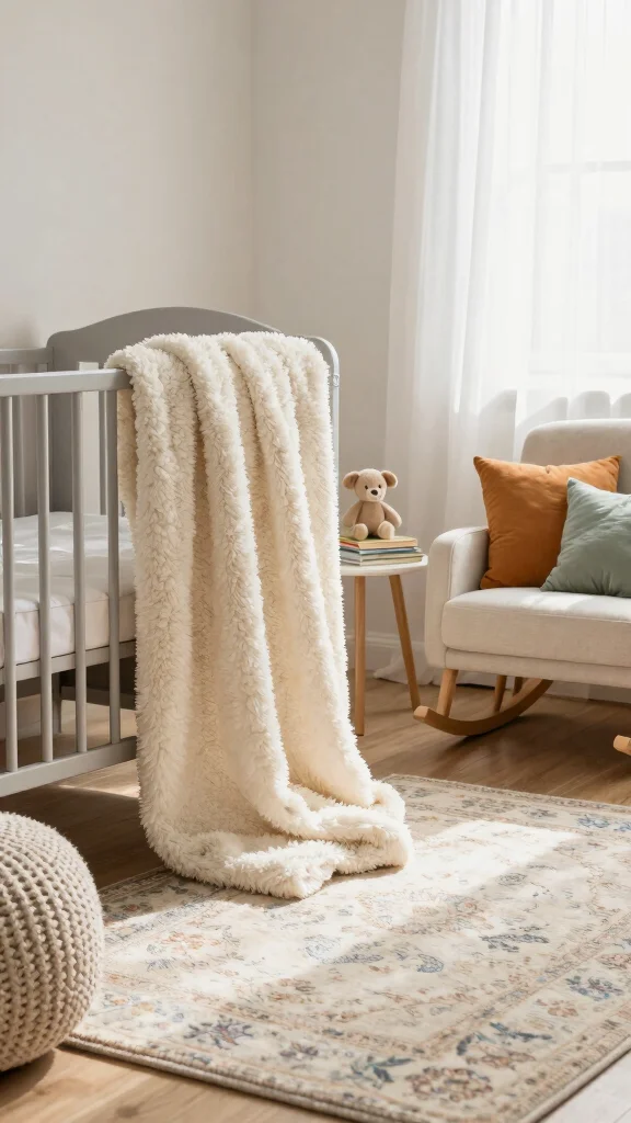 Use a neutral backdrop and add color through textiles, rug patterns, and wall art to keep the look tied to baby room themes.