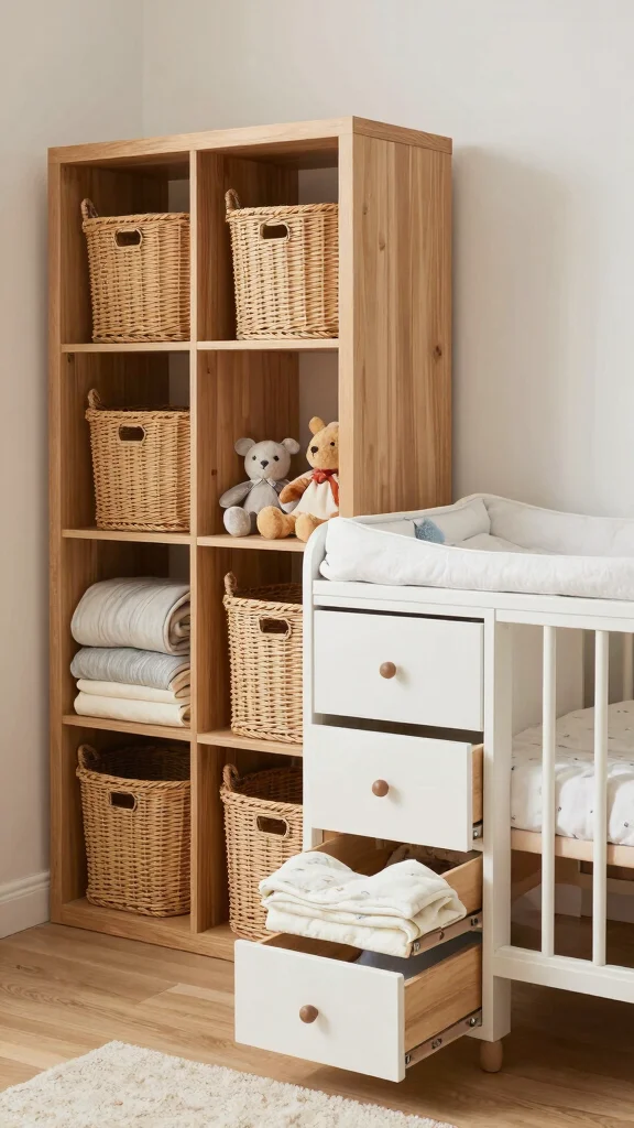Implement functional storage solutions to keep the nursery organized and clutter-free, promoting ease of access.