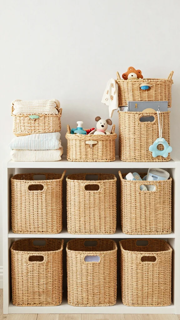 Storage baskets are a stylish and practical solution for organizing baby essentials in your baby corner. Opt for baskets in various sizes and materials that align with your decor theme, such as woven options that add texture while providing functional storage for toys and supplies.