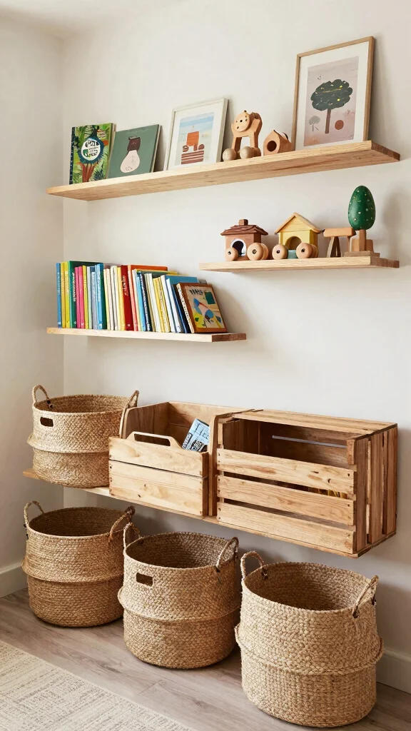 Incorporate bamboo or reclaimed wood storage baskets to keep the space organized, a key element of smart nursery decor ideas.
