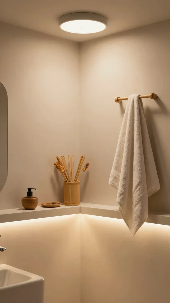 For practical implementation, consider using LED strip lights under cabinets for a contemporary touch. Stylish fixtures that complement your decor can also add elegance to your space. This approach connects your bathroom to current trends in energy efficiency and wellness, enhancing the overall experience.