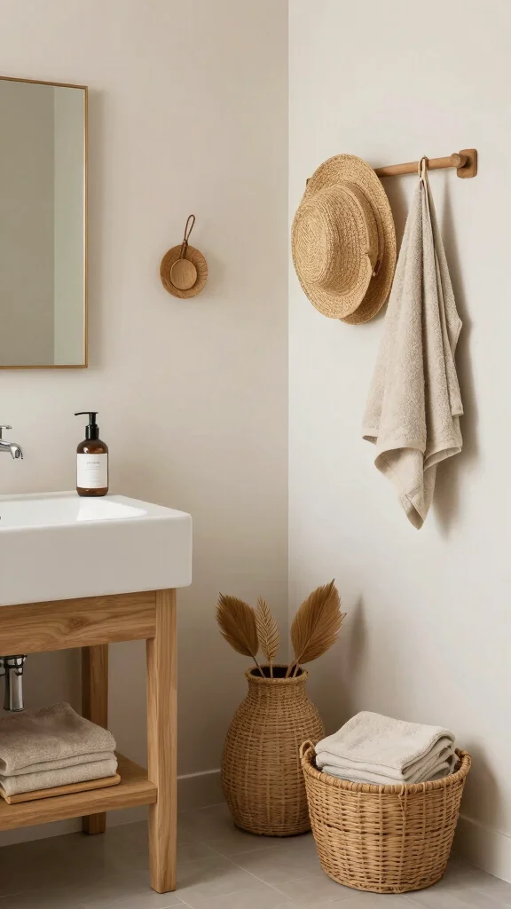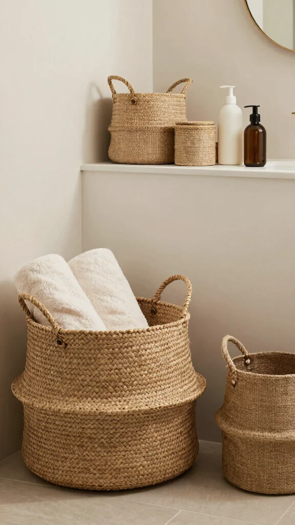 Natural fiber baskets are both functional and aesthetically pleasing, enriching your bathroom decor sustainably.
