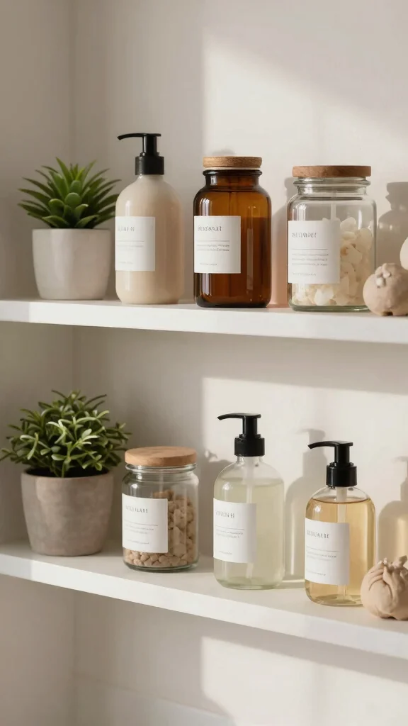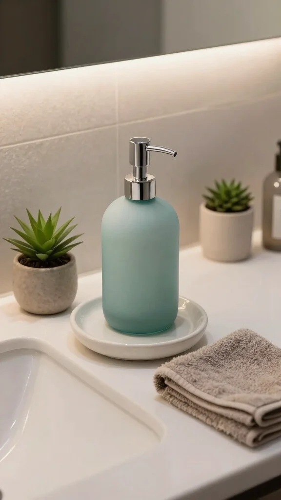 Incorporate recycled glass soap dispensers for an eco-friendly and stylish alternative to plastic containers.