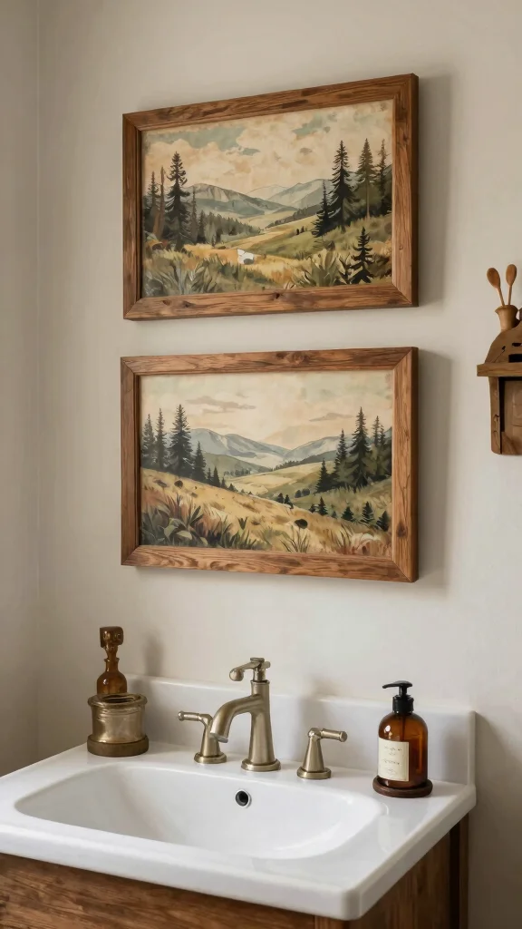 Incorporating country style wall art personalizes your bathroom while enhancing the rustic theme. Look for artwork featuring natural landscapes, farmhouse motifs, or vintage advertising posters that evoke nostalgia and warmth.