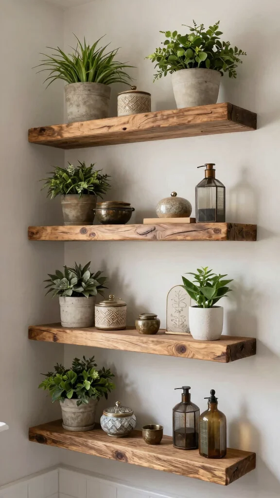 Use them to showcase decorative items, plants, or even books, enhancing the cozy, welcoming feel of the bathroom.