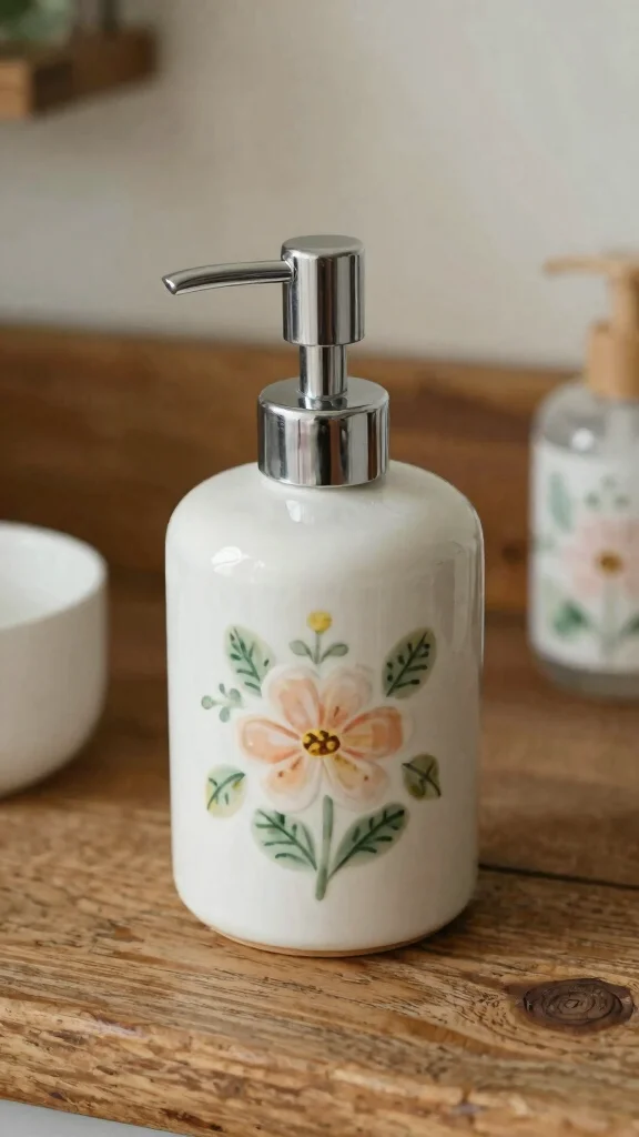 A vintage-style ceramic soap dispenser brings a touch of elegance to your rustic bathroom. Its soft curves and intricate designs elevate the space while serving a practical function. Opt for muted colors or floral patterns that harmonize with the farmhouse aesthetic, adding a sense of nostalgia.