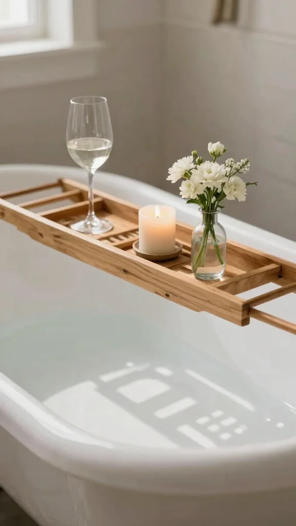 A wooden bath caddy adds a luxurious touch to your farmhouse bathroom, transforming bath time into a serene experience. Imagine unwinding in a warm bath while enjoying a glass of wine and a good book, all within reach on your stylish caddy. Opt for reclaimed wood for an authentic and eco-friendly choice that enhances your rustic decor.