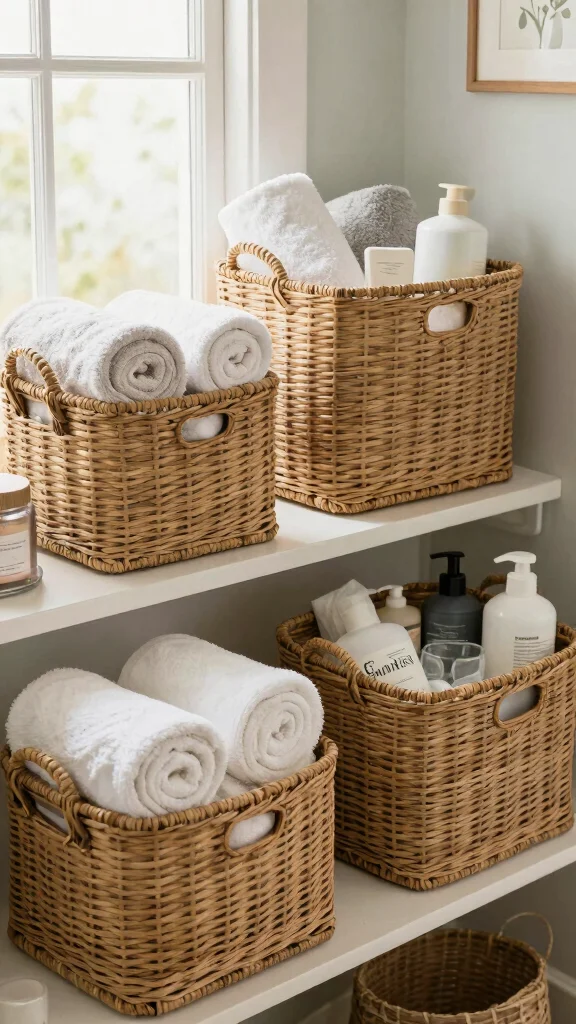 With woven baskets, you achieve both functionality and the rustic charm that makes your bathroom feel cozy.