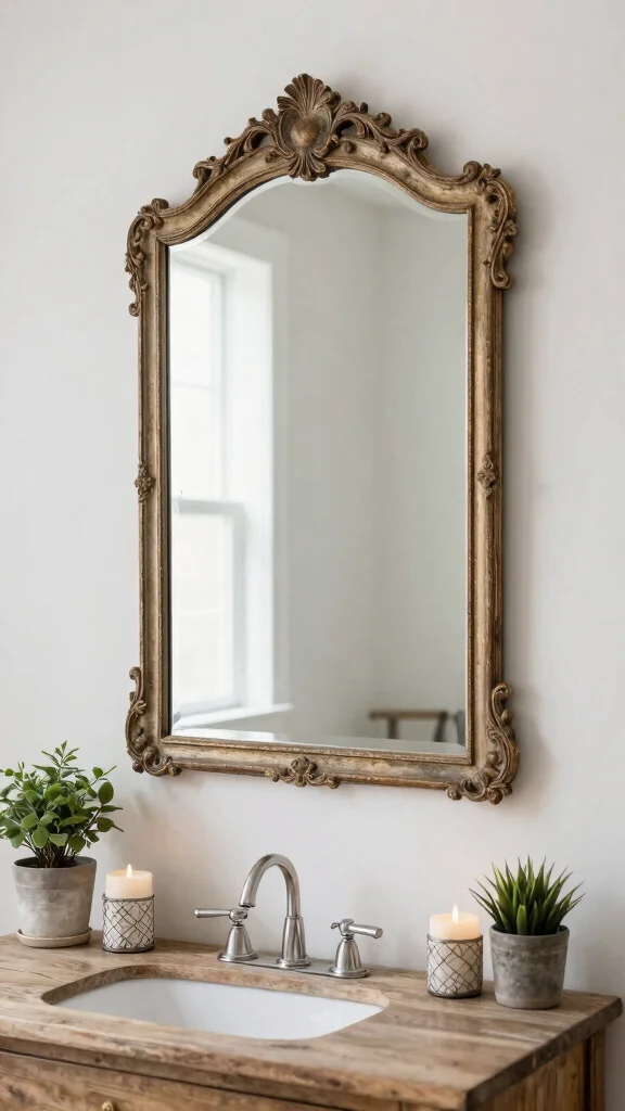 An antique mirror serves as a stunning centerpiece in your rustic bathroom, adding depth and character. Look for ornate frames that elevate your decor and create a captivating focal point. Mirrors not only reflect light but also make your space feel larger and more inviting.