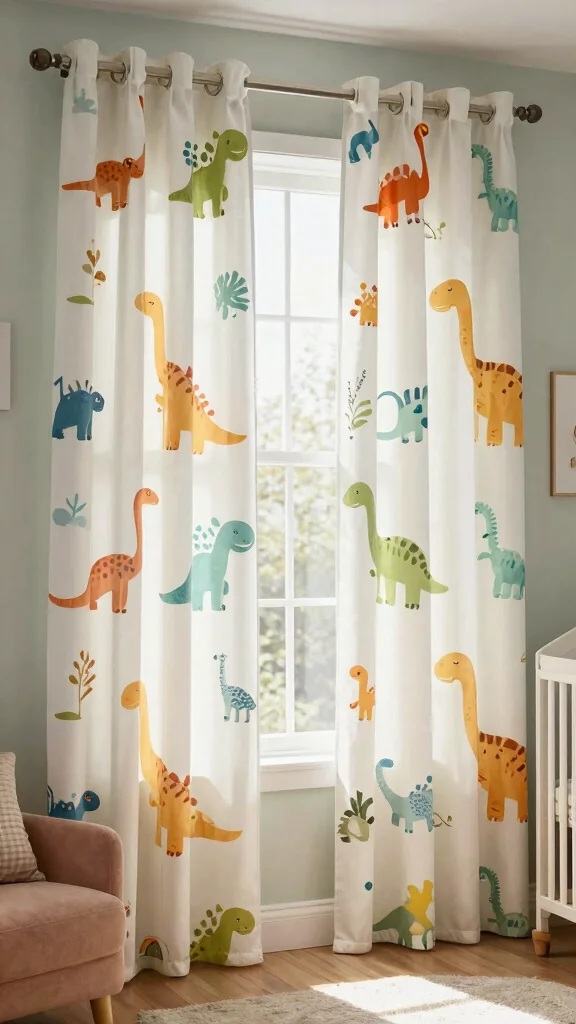 Dinosaur-themed curtains can beautifully tie the nursery together while adding a pop of fun. Look for designs featuring dinosaurs in vibrant colors or soft pastels that align with your decor style. These curtains frame the windows perfectly, adding character and charm to the space while controlling light for a cozy atmosphere.Opt for blackout curtains that help create a dim environment for naptime, ensuring your little one can rest soundly. Mixing patterned curtains with solid colors in other elements can maintain balance and prevent the room from feeling chaotic. Consider adding playful curtain tiebacks featuring dino motifs for an extra touch of creativity.Explore these suggestions for your curtain choice: