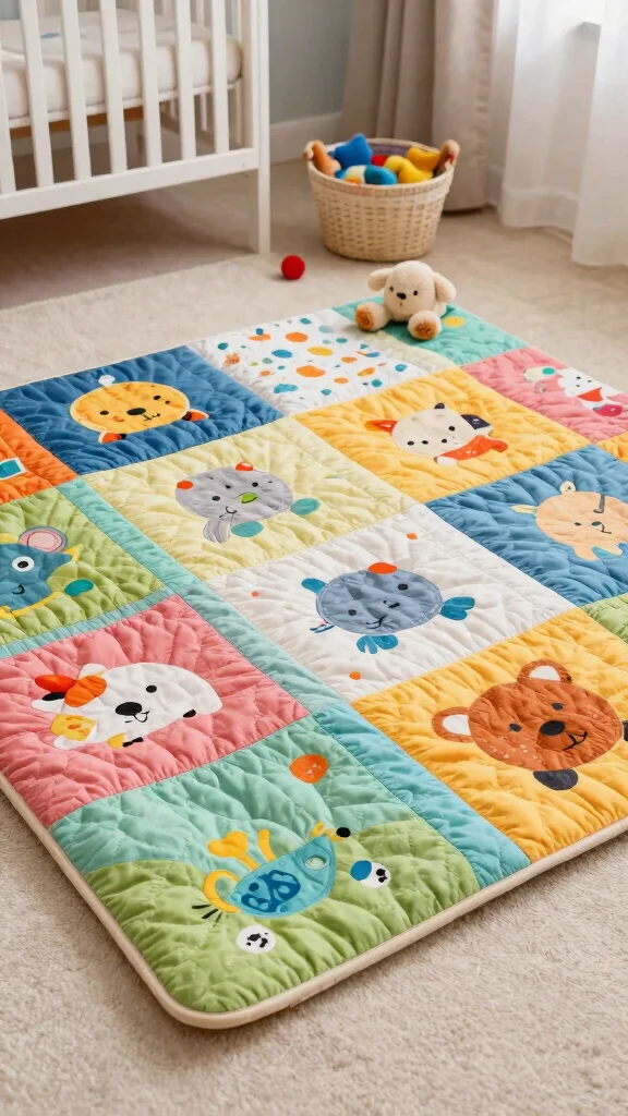 Create a cozy and colorful quilted play mat that offers your baby a comfortable space to play. Using scrap fabrics, you can stitch together a soft quilt that serves as a beautiful decor piece when not in use. This mat provides a safe surface for tummy time while adding visual interest to the nursery.