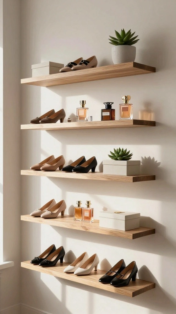 Wall-mounted shelves can elevate your dressing room’s organization and style simultaneously. Opt for floating shelves to achieve a sleek, minimalist look or choose rustic wooden options to infuse warmth into the space. Perfect for showcasing shoes, bags, or a small perfume collection, these shelves can be installed at eye level for easy access, transforming your walls into an attractive feature.