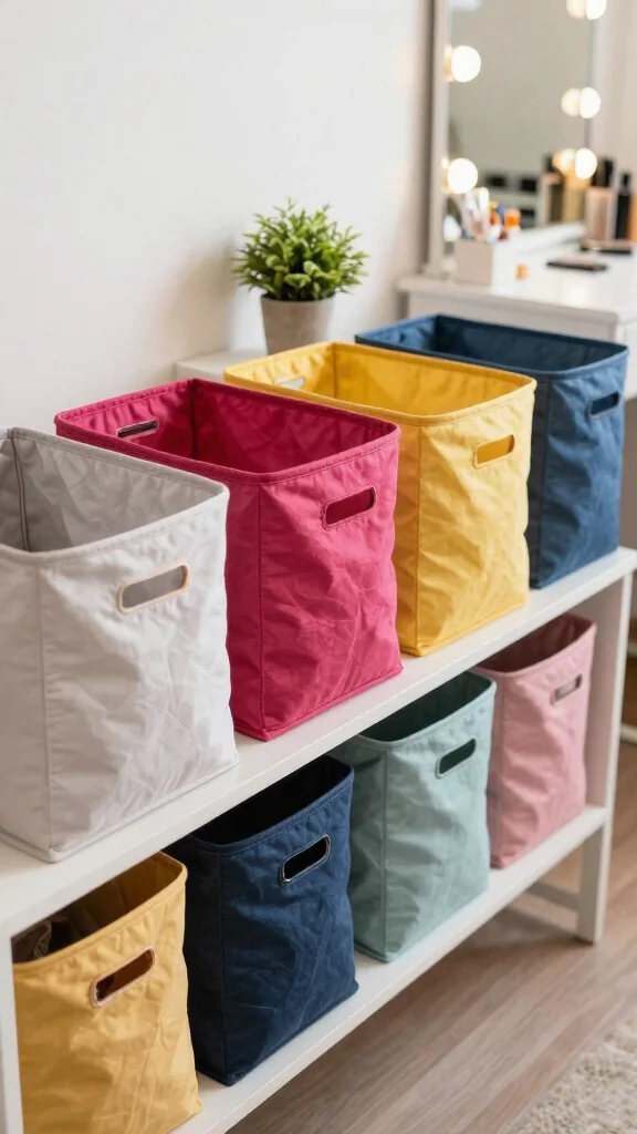 Fabric bins are an excellent way to organize your items while injecting color into your dressing room. You can either purchase affordable bins or craft your own using fabric and cardboard, making them customizable to fit your decor. These versatile storage solutions are perfect for holding accessories, shoes, or folded clothes and can be easily stacked or placed on shelves.