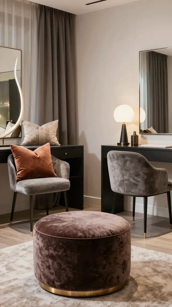 Seating is more than just comfort—it’s part of your decor! Select elegant chairs, ottomans, or benches that reflect your personal style while providing a cozy place to rest as you choose your outfits. The right seating can add sophistication and comfort to your space.