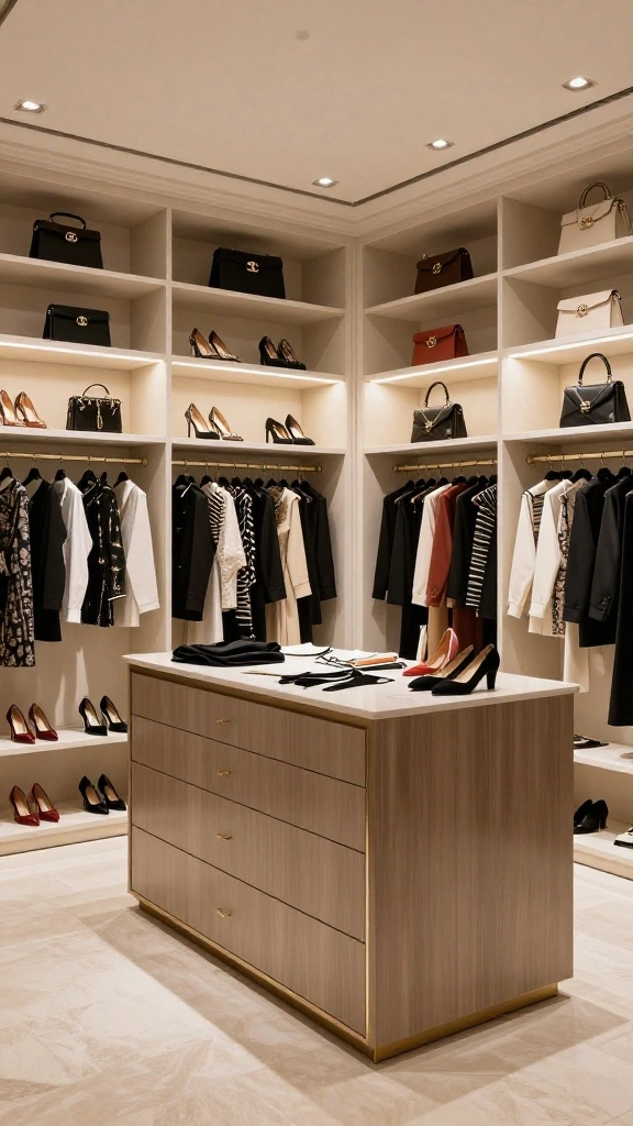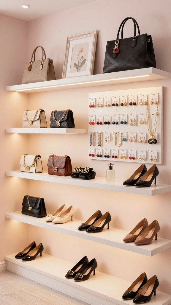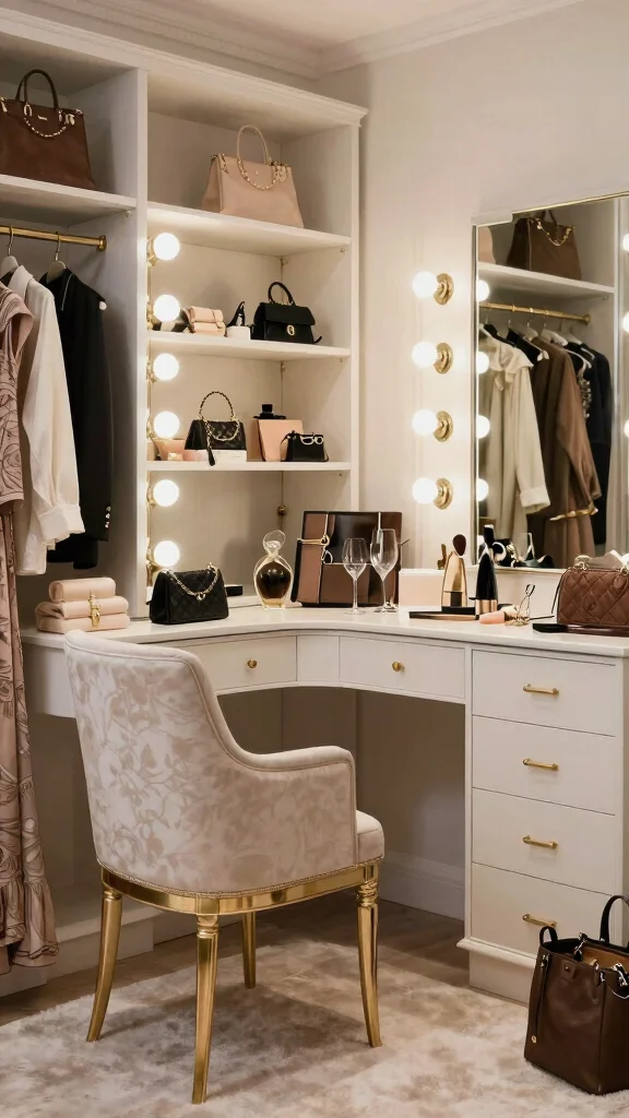 Your accessories deserve to be displayed beautifully. Create a striking setup for your jewelry, handbags, and shoes that makes them easily accessible while adding a decorative flair to your dressing room. Open shelving or glass display cases can showcase your favorites effectively.