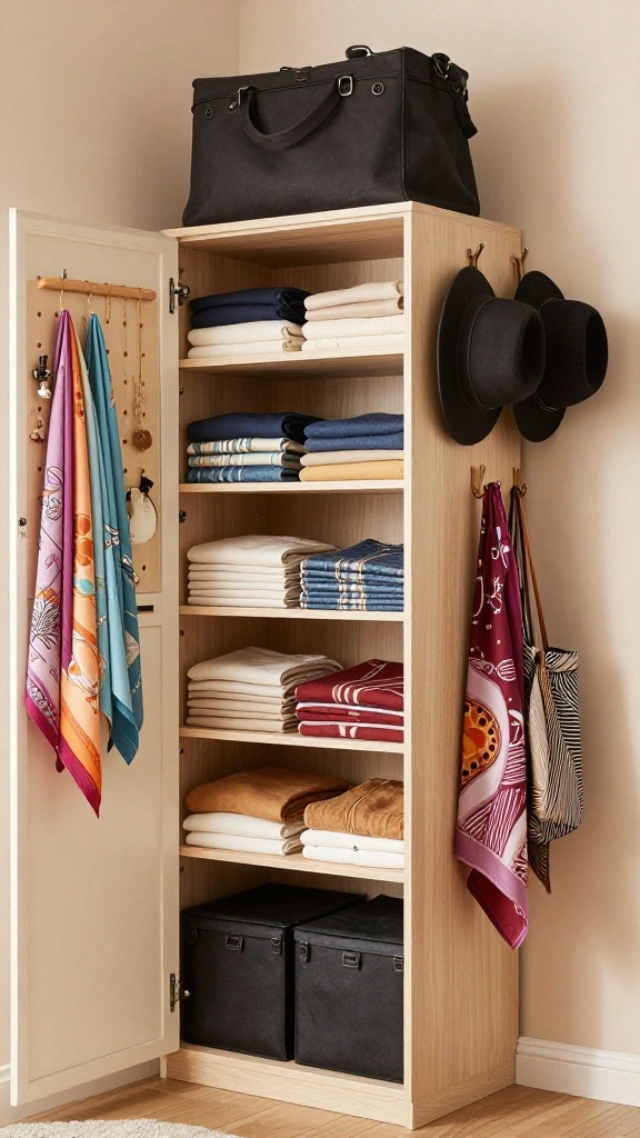 Tall cabinets or shelving units can neatly store clothes and accessories, freeing up floor space for a more open feel. Consider using stackable bins or hanging organizers on cabinet doors for added efficiency.