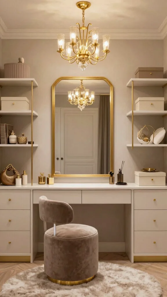 Use glamorous gold accents like handles and frames to elevate the luxury feel of your dressing room.
