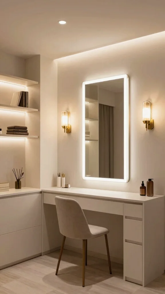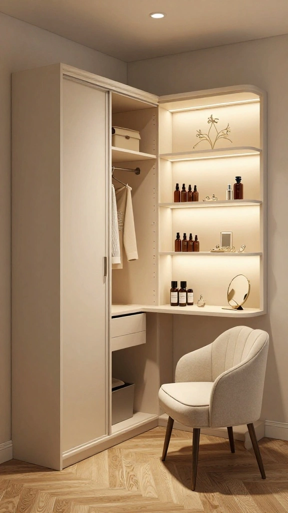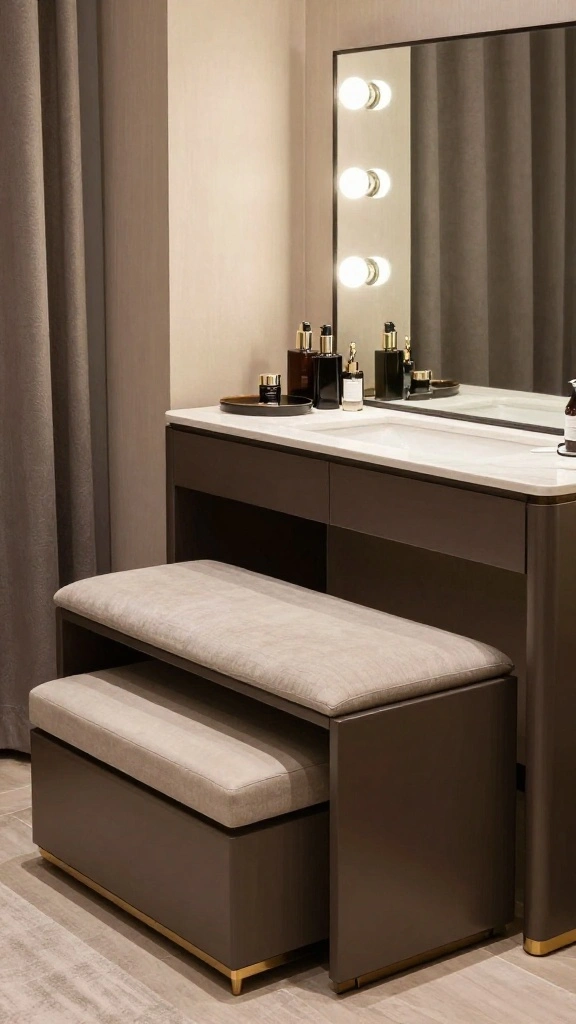 A fold-out vanity table can save space while still providing a convenient area for getting ready. The key is to choose pieces that offer versatility while maintaining an appealing aesthetic.
