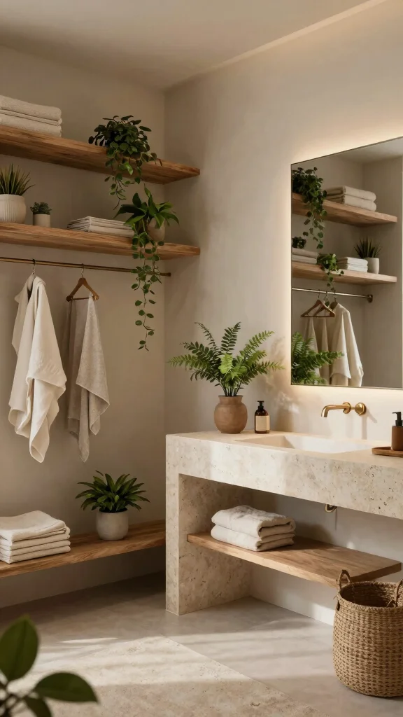 Consider using wooden shelves or a stone-topped vanity to infuse an earthy touch. Adding plants not only improves air quality but also elevates the aesthetic appeal of your dressing room.