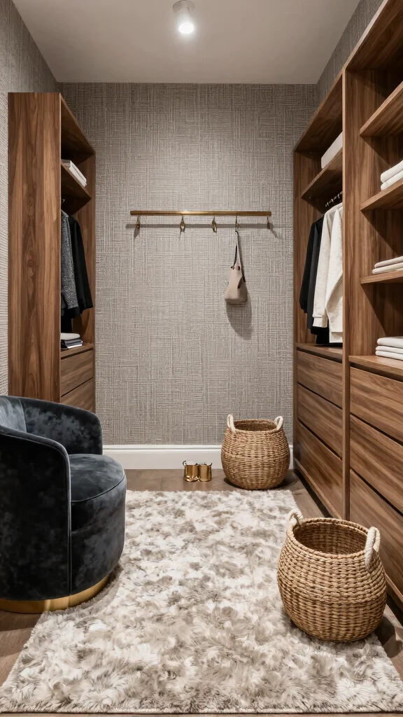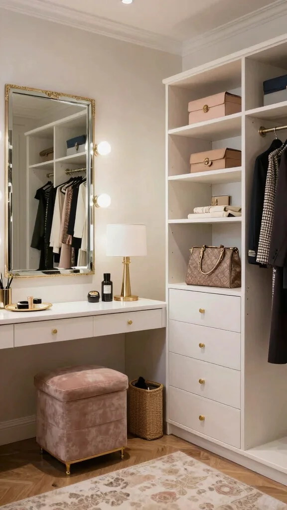 Go for stylish storage solutions that hide clutter while looking premium. Think built-in cabinetry with push-to-open hardware and mirrored fronts to reflect light, glass-front organizers for a sense of airiness, and slim pull-out drawers for makeup and jewelry. Use under-seat storage in a compact bench, lift-top ottomans, and a shallow ceiling-height shelf that runs around the perimeter for accessories. Labeling helps keep everything in its place, boosting closet organization and making the space feel like a luxury dressing room.
