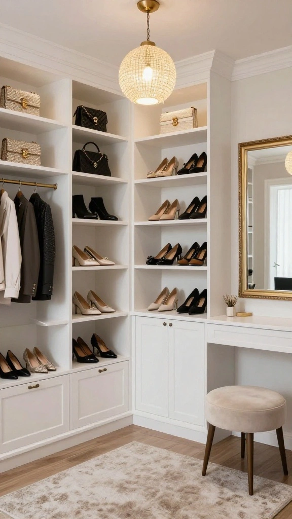 These functional displays not only keep your shoes organized but also serve as a fashionable design element in your dressing room.