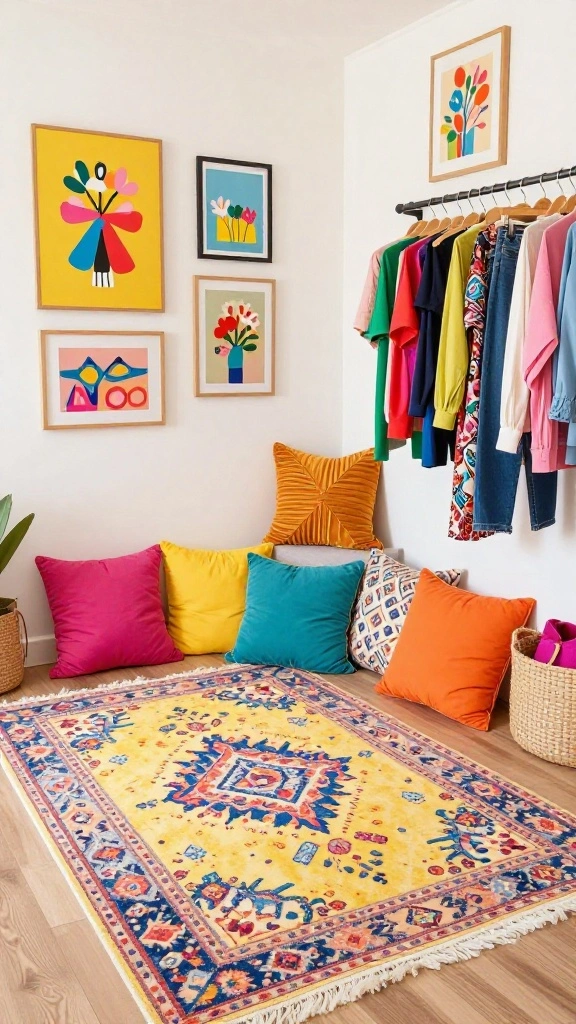 To effectively incorporate colorful accents, consider these suggestions: opt for colorful storage solutions that keep things organized in style, add a bold rug to define the area, and include decorative items in varying colors that complement your main palette.