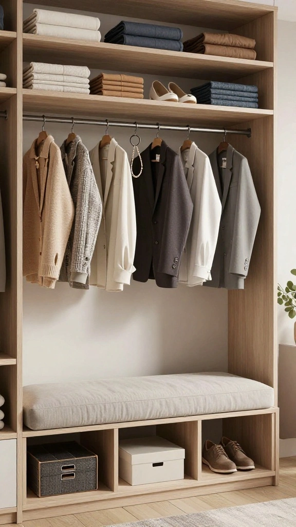 Consider these storage ideas: utilize under-bed storage for seasonal clothes, select a bench with built-in compartments for dual functionality, and hang hooks to keep accessories visible and easily accessible.