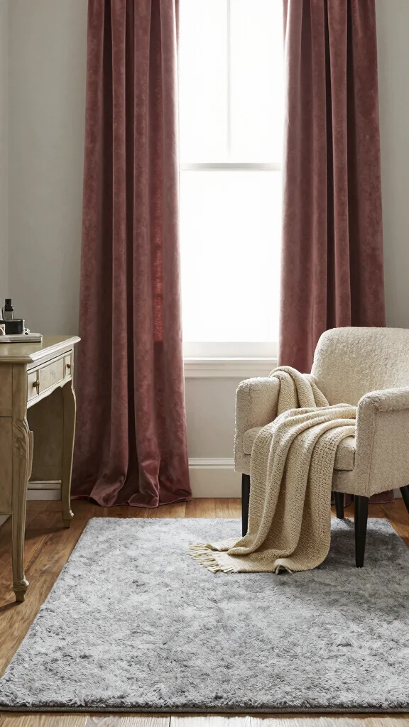 To create a layered look, consider these textile tips: mix fabrics like velvet, linen, and wool for visual interest, place a runner rug to define spaces within the room, and opt for heavier drapes for drama and light control.