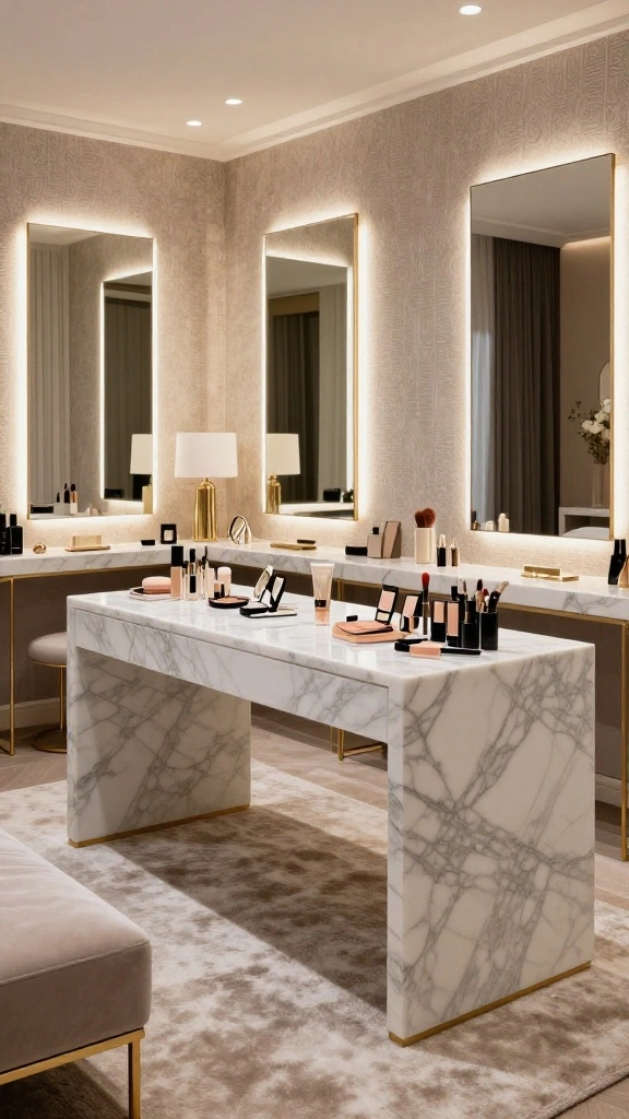 To achieve this look, consider incorporating gold or brass elements, like drawer pulls or light fixtures, that beautifully contrast with the cool tones of marble. Ensure your island provides ample storage for accessories, keeping your space organized and clutter-free, which is essential for a serene dressing area.