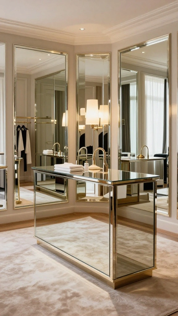 Pair your mirrored surfaces with stylish lighting for an added touch of glamour. This combination ensures functionality while enhancing the overall ambiance of your dressing room.