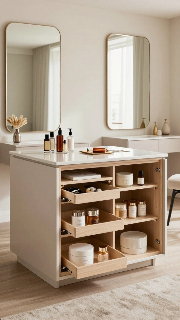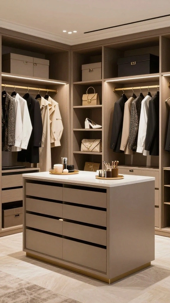 Consider a dual-purpose island that seamlessly combines workspace and storage. This innovative design maximizes functionality, meeting various needs within your dressing room. For example, one side can serve as a grooming area, while the other offers organized storage for accessories.