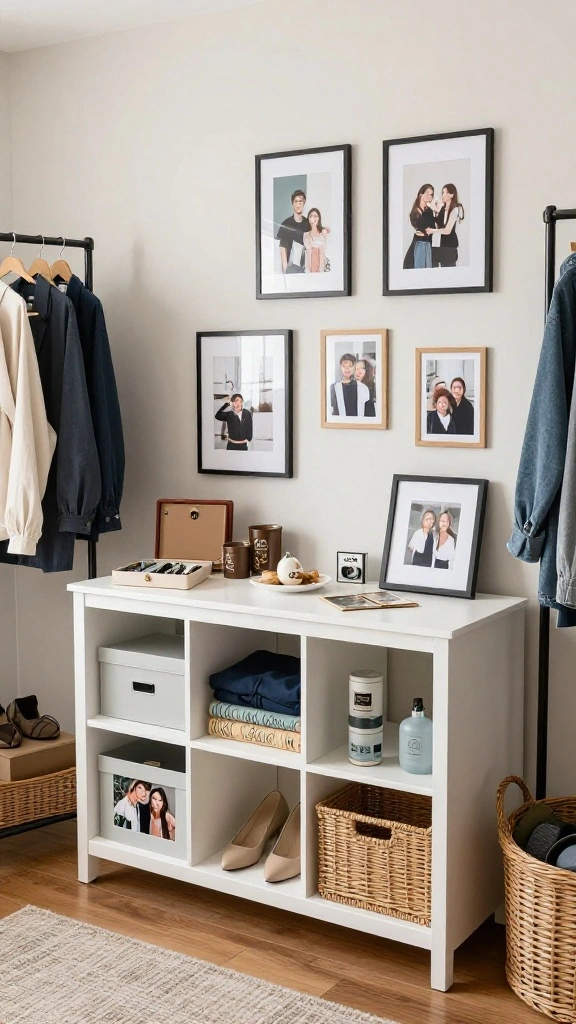 Showcasing stylish handbags or jewelry not only adds personality but also keeps your essentials accessible. Use decorative boxes or trays to categorize your items, ensuring a clean and organized look.