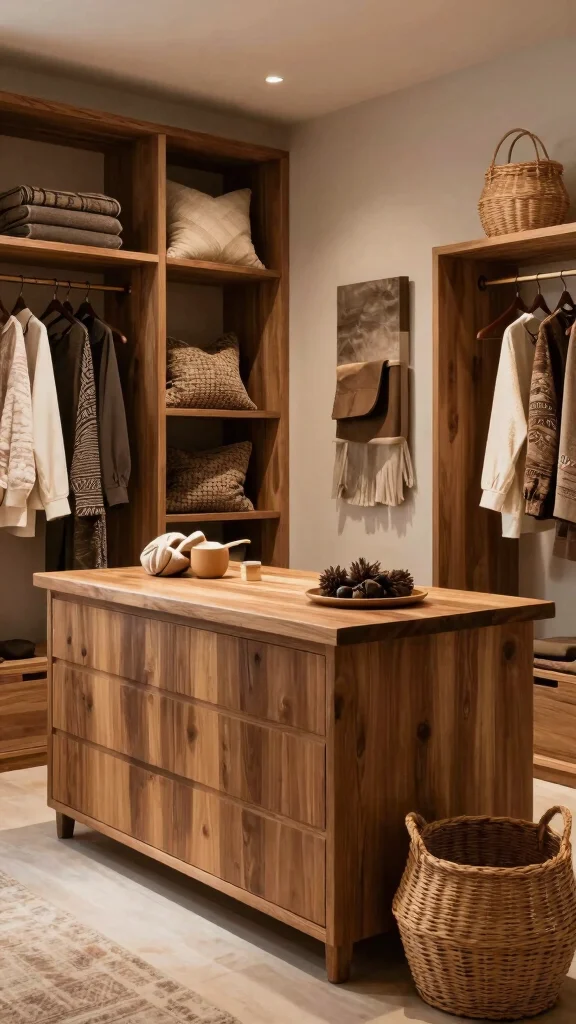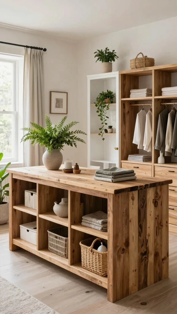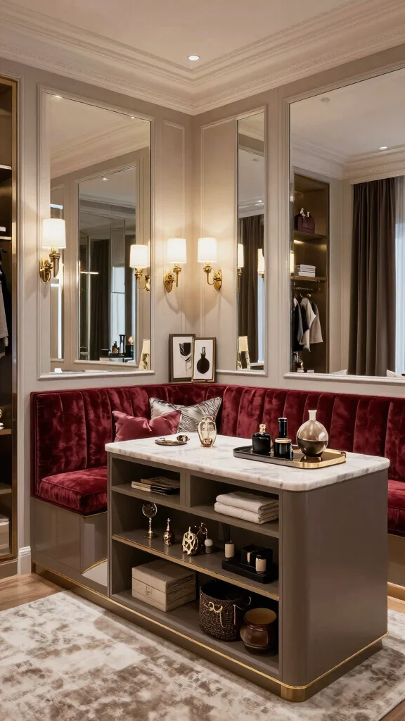 For the island, a wooden base paired with a smooth countertop can create a beautiful contrast. Adding soft textiles, such as throw pillows or a chunky knit blanket, enhances comfort and style in your dressing area.