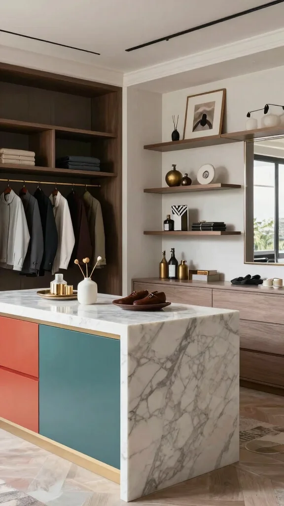 Bring personality to your dressing room with colorful cabinets on your island. Today’s trends favor rich hues like deep navy or soft blush that breathe life into your space while maintaining elegance. These vibrant colors can beautifully complement your overall decor theme.