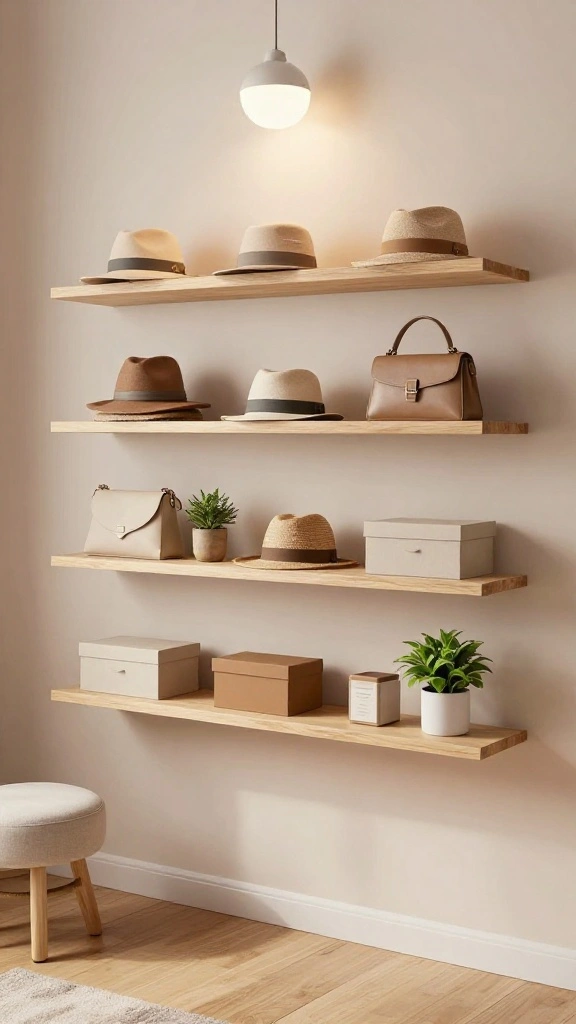 Utilize floating shelves to maximize wall space, keeping your floor area open and organized.