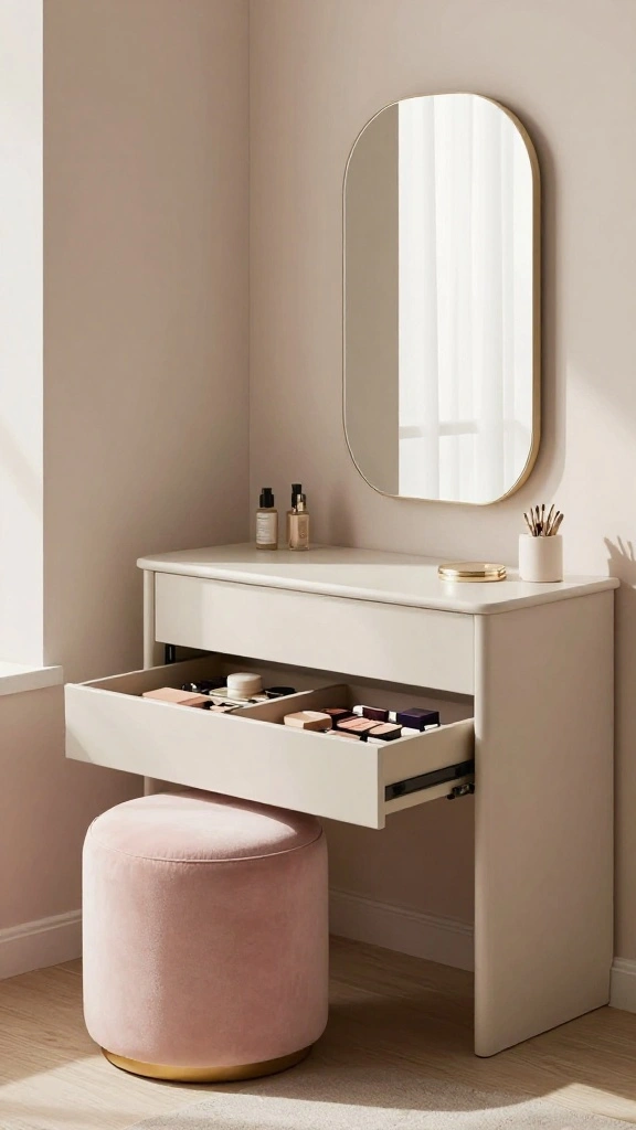 Go vertical with wall-mounted organizers and ceiling-to-floor storage. Choose furniture with built-in storage—think a bench with drawers or a vanity that doubles as a dresser—to reduce clutter. Finish with clear bins and a daily reset habit to keep the space tidy and functional.