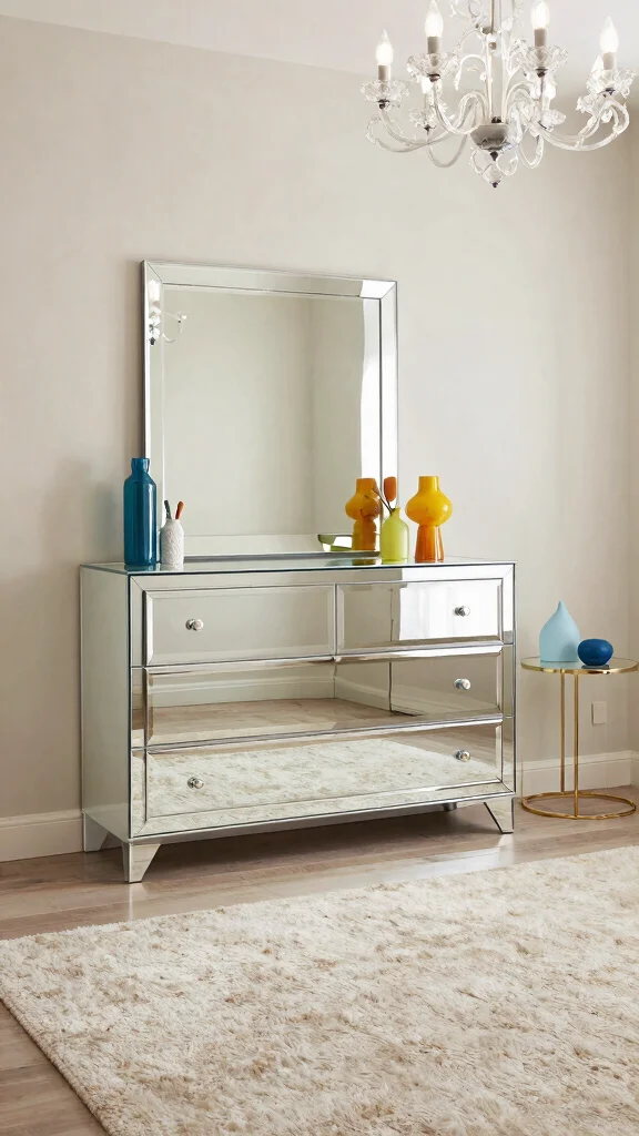Use mirrored furniture to create the illusion of a larger space, adding both style and depth to your dressing room.