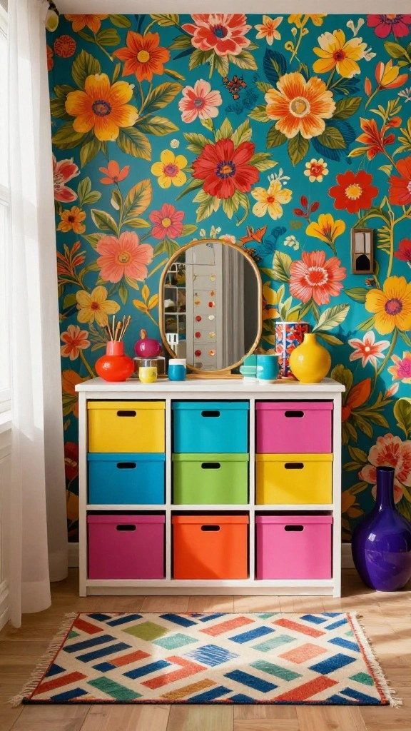 – Choose colorful storage boxes to add a playful touch to your shelves.